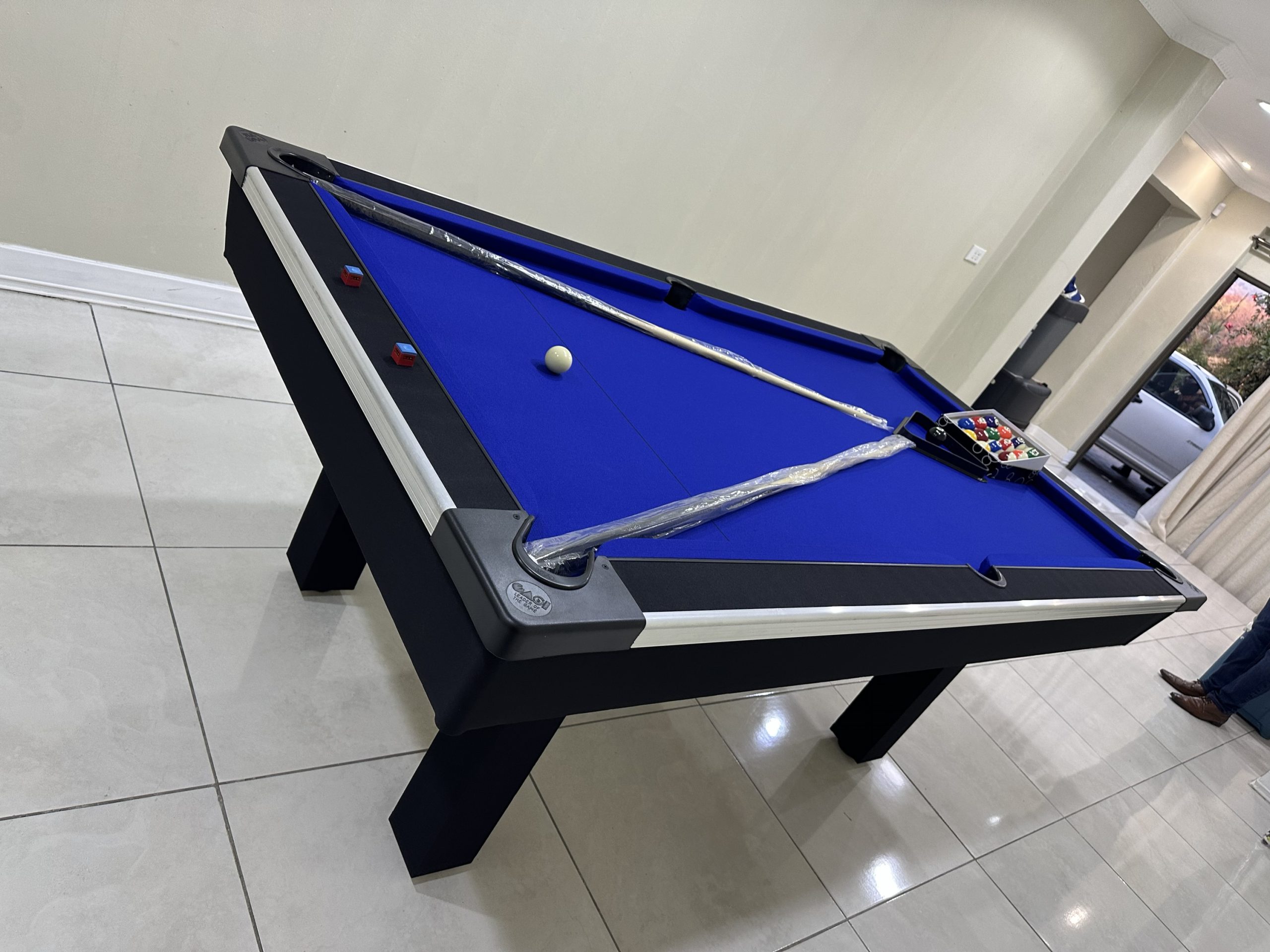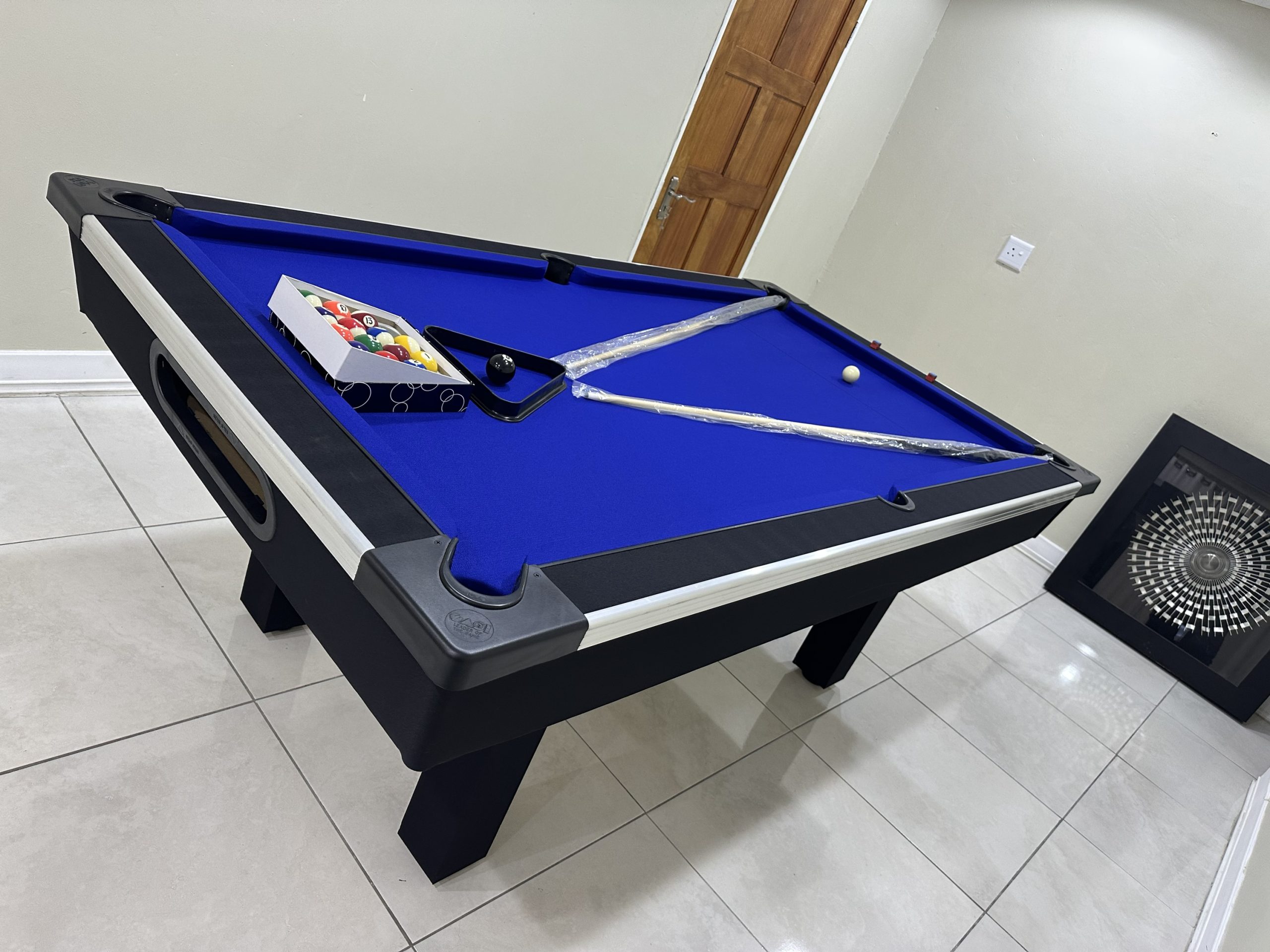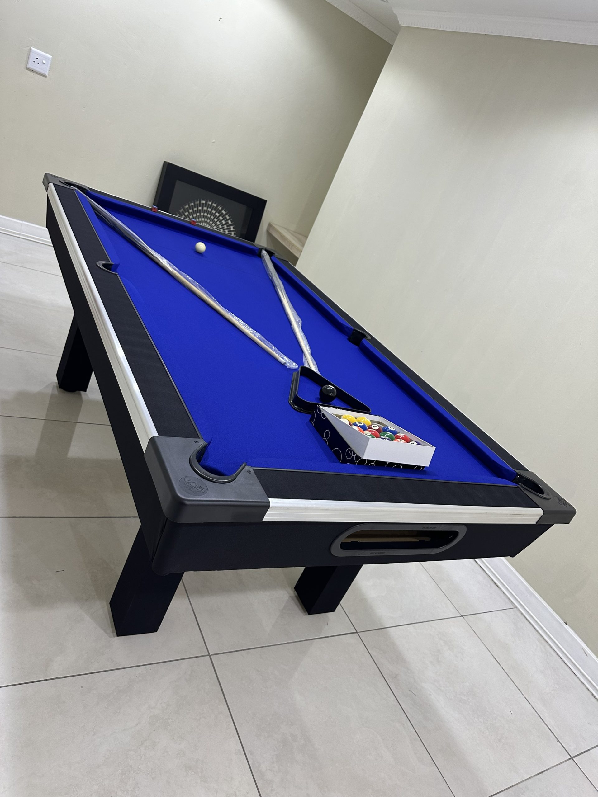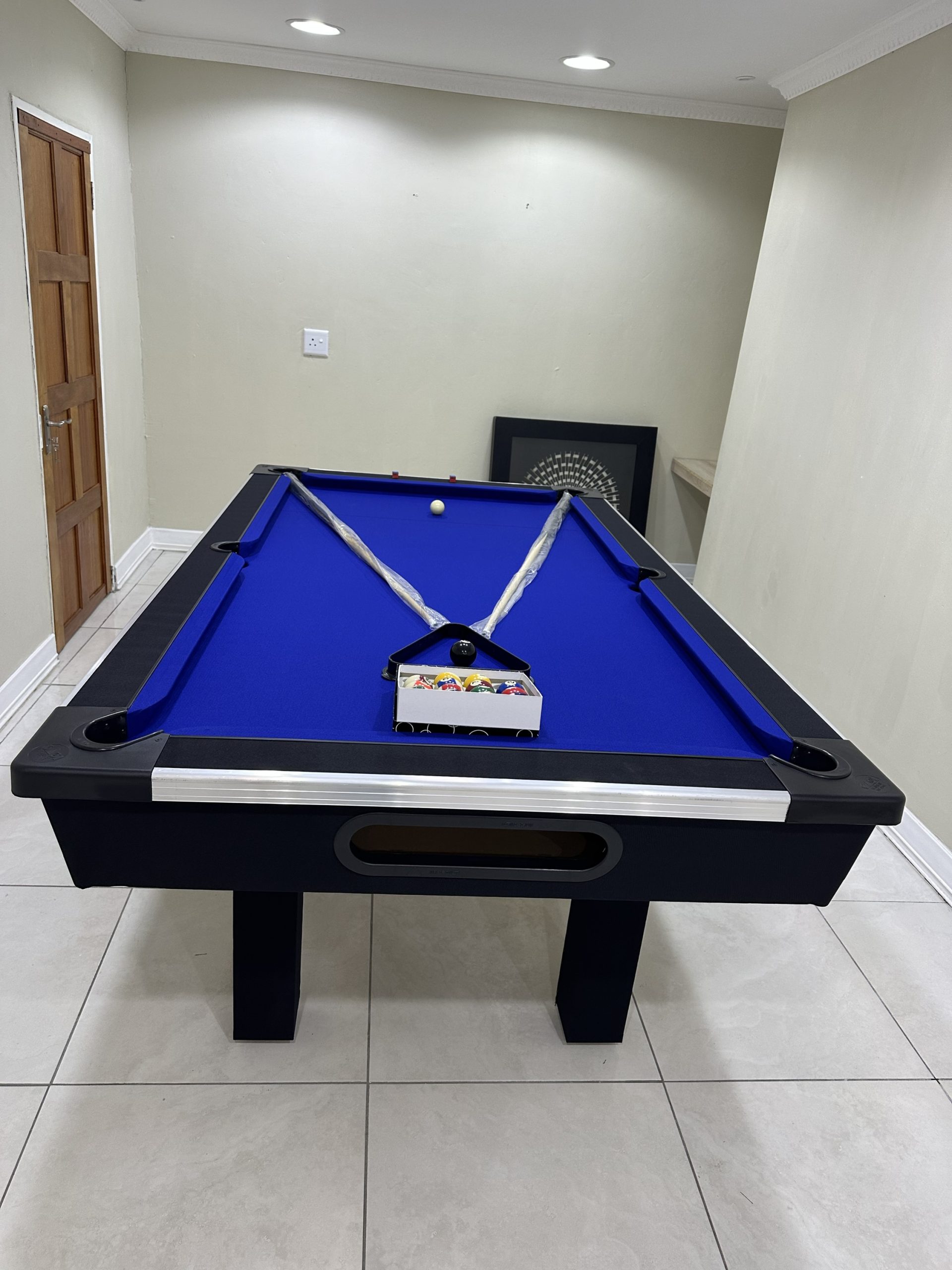 Our pool tables are manufactured from A Grade commercial boards. Our Tables are fitted with buffalo speed cloth giving a wood top the speed, easy maintenance and durability. Our tables has ball return feature with a PVC strip for modern finishes with aluminium beading on the sides for modern designs and to stand out in your entertainment room.